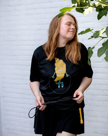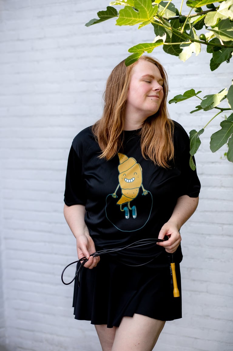 I was talking to my big sister Luka about how much joy jump rope brings me. Luka is an amazing artist, full of ideas. She likes cycling, reading and wandering around cities looking for inspiration, tea drinking on rainy days and cats. Luka has been drawing for years and our conversation inspired her to draw something jump rope related. Before we knew about it – the Jumping Croissant was born.